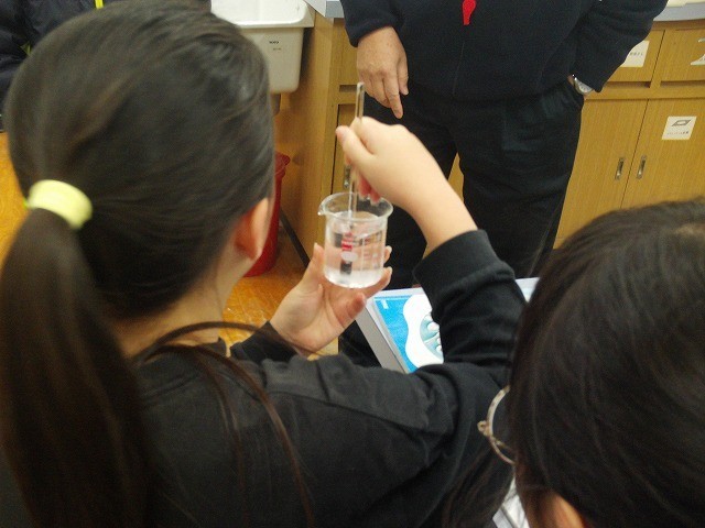 ものが水に「とけた」「とけていない」を見分けるのを、いろいろな材料を使って調べてみました。片栗粉、塩、砂、砂糖など、水に入れてかき混ぜて様子を見ました。透明になればとける、ならなければとけないというのを確認し、ノートにまとめていきました。