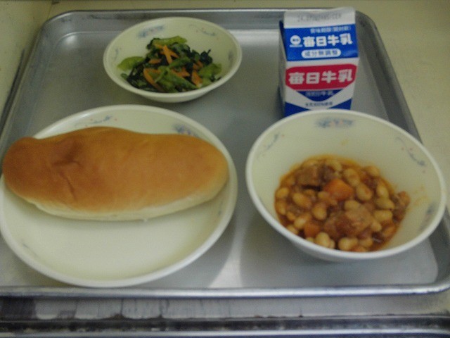 今日の献立は、ミルクコッペパン・牛乳・ポークビーンズ・小松菜のソテーです。