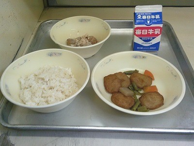 今日の献立は、麦ごはん・平天の煮つけ・揚げ里いものあんかけ・牛乳でした。