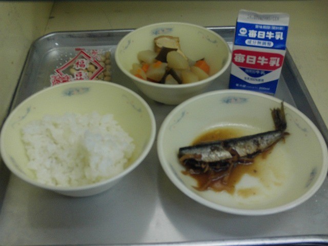今日の献立は、ごはん・牛乳・いわしのしょうが煮・関東煮(昆布入り)・いり豆です。