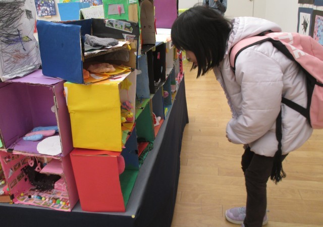 「小さな巨匠展」を鑑賞しに出かけました。会場に着くと、すぐに自分の作品を見つけていました。その後、たくさんの作品をじっくりと鑑賞していました。