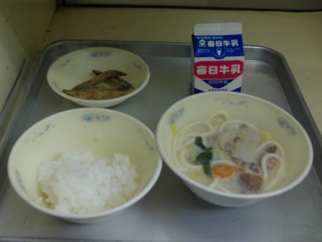 今日の献立は、減量ごはん・牛乳・きびなごのこはくあげ・豆乳鍋(うどん入り)です。