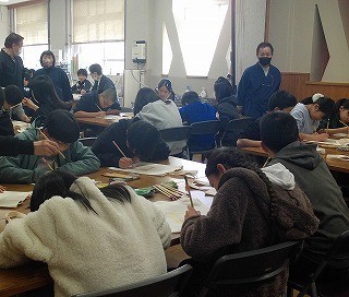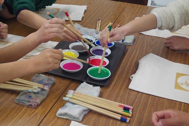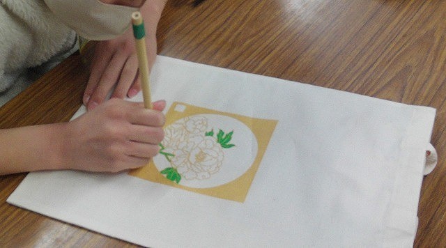 京の「匠」ふれあい事業として、京都手描友禅協同組合の方々に来ていただき、京友禅について制作過程等を聞き学びました。その後、金彩で下絵が書かれた手提げ袋に色をのせていきました。どの色にしようかなと楽しみながら、筆を立てて少しずつ、慎重に作業に取り組んでいきました。