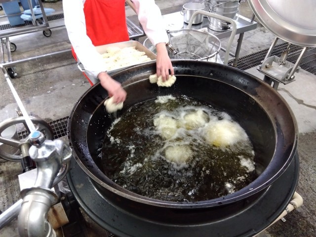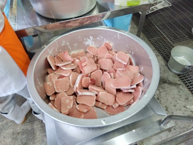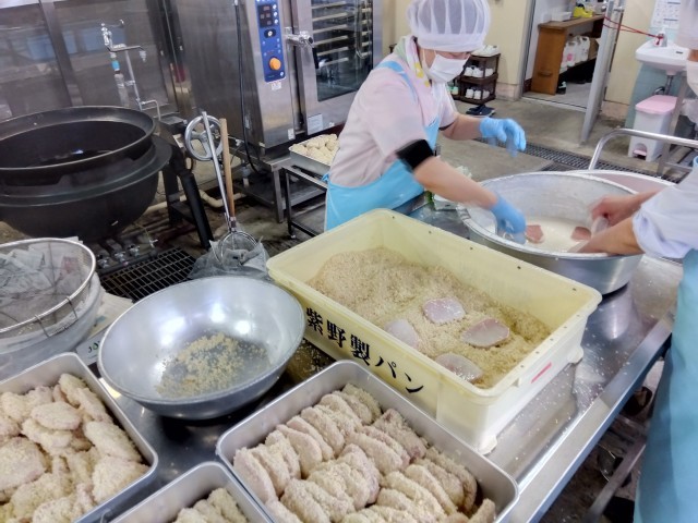 今日の給食は、卒業祝の献立です。給食調理員さんがトンカツ、一枚一枚を丁寧に下ごしらえし、衣をつけて、心をこめてあげました。