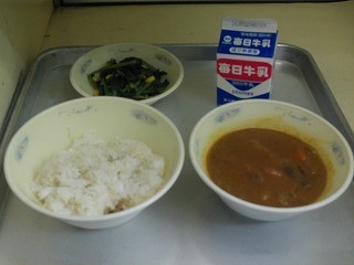 今日の献立は、麦ごはん・牛乳・カレー・ほうれん草のソテーでした。