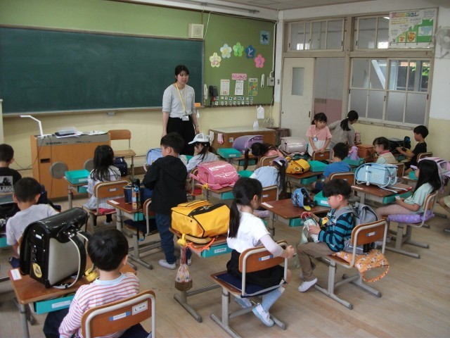 1年生今日は、学級活動ではみんな遊びをしました。国語では教科書を使い勉強しました。音楽ではみんなで歌を歌いました。図工ではパスを使い画用紙に絵を描きました。生活科では学校探検で運動場に行きました。今日で3回目の給食では準備、後片付けもうまくできるようになり、みんなで美味しく食べました。登下校や自分で学習の準備、後片付けも頑張っています。そしてお友達と協力して活動する様子がたくさん見られました。入学して1週間、1年生よく励みましたね。来週もみんなで頑張ろう!