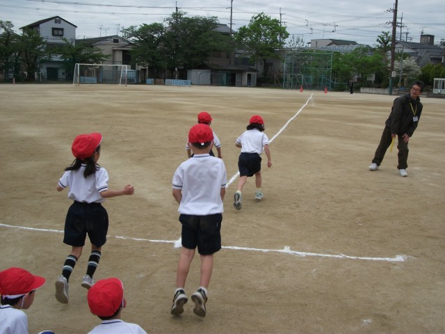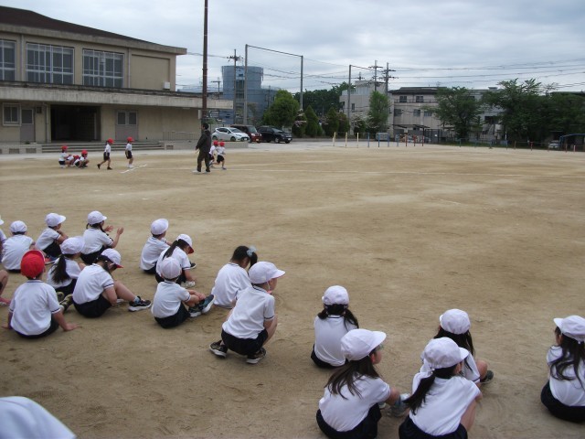 今日の体育は50メートル走です。広い紫竹校の運動場で頑張って50メートルを走りました。待っている間は友だちの応援です。みんなで体を動かし、応援して気持ちのいい汗をかいた体育の学習でした。