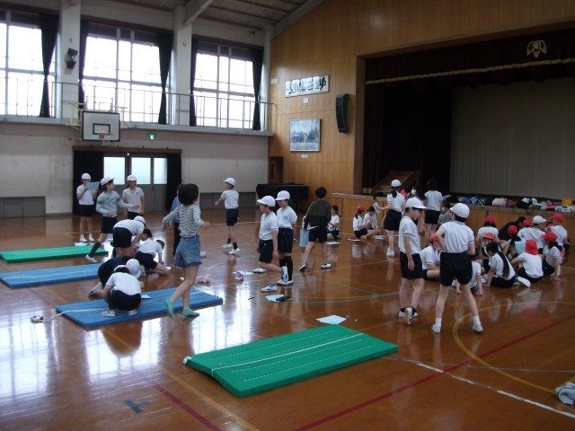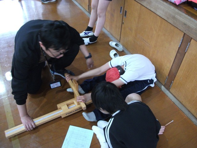 体育館で新体力テストの長座体前屈、立ち幅とびなどを行いました。グループで協力しながら取り組みました。種目は多く、これからも学年で取り組んでいきます。