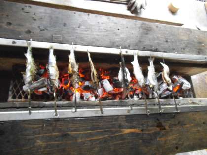 思ったよりも早く雨が上がりました。今日予定している活動プログラムは実施しますが,少しずつ内容を変更します。魚つかみは池に入って行う予定でしたが,たらいの中の魚を手づかみすることにしました。その後,指導員さんからさばき方を教わり,実際に自分でつまえた魚をさばき,焼いて食べました。命をいただくということの意味を実感することができる貴重な体験となったのではないでしょうか。