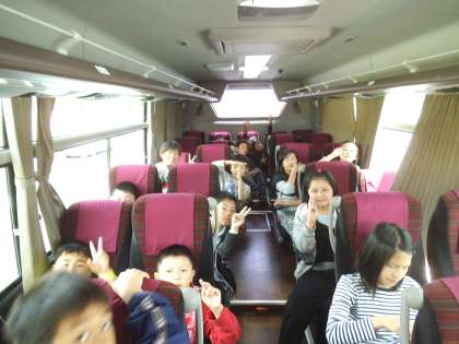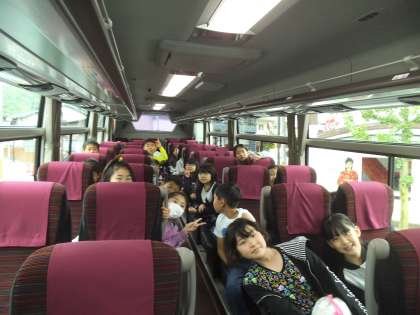 バスの中には大きな座席,そしてその数にも余裕があります。子どもたちは口ぐちに話していましたが,そのうちに皆でキャンプファイヤーの歌を歌ったり,出し物のセリフを言い合って盛り上がったりして楽しんでいました。式を進行する係の子どもはその練習をするなど,自分の役割を果たそうという意識も伝わってきました。