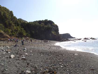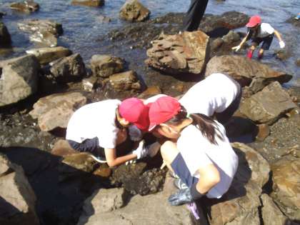 宮崎浜は歩いて5分ほどのところにあります。大潮ではなかったので,観察できる範囲がそんなに広くなかったのですが,時間を惜しんで海の生き物を探し,とても興味深く観察していました。