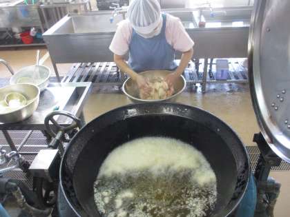 今日は給食調理員さん手作りのチキンカツの登場です。