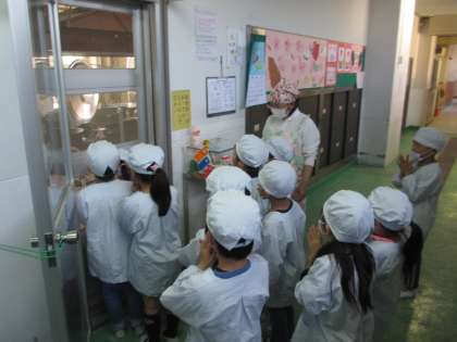 給食当番が給食室に到着すると、とてもいい香り。「おいしそう!」「おなかすいた…」「チキンカツ♪チキンカツ♪」と喜びながら教室にもっていきました。