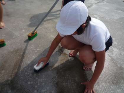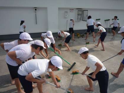 水泳学習に向けて,5年生と6年生がプール掃除を行いました。プールの中やプールサイドなどたくさんの汚れが染みついた部分をたわしやブラシを使って,ゴシゴシと磨きました。黒く汚れた部分も白くピカピカに変わっていました。子どもたちが気持ちよく使えるように高学年の子たちが汗をかきながら頑張ってくれました。さすが高学年。もうすぐ始まる水泳学習が楽しみです。