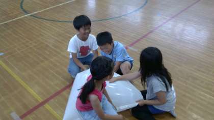 90Lのゴミ袋に空気を閉じ込め袋をおしたり,袋に乗ったりしました。
