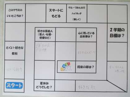 学活の時間にはもう一度みんなのことを知るために6年1組すごろくをして,コミュニケーションをとりました。