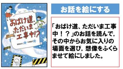 教室後方の掲示板を図工の「お話しを絵にする」の作品にリニューアルしました。