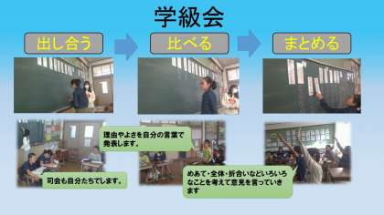 学級会「運動会がんばった会をしよう」をしました。6年生になると,司会グループが話し合いを進めて,意見を言う人が前の人の意見「〜も言ったように」「私も〜で」や反対意見をルールを工夫することで賛成にできるような意見を言うなど素晴らしい意見がありました。
