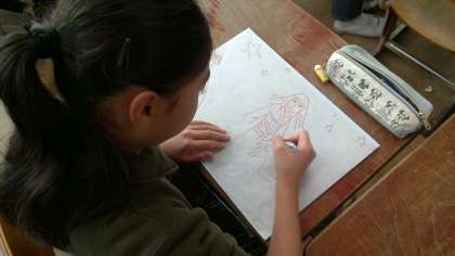 題材を絵本の中から探し,下絵を描き版に写していっているところです。