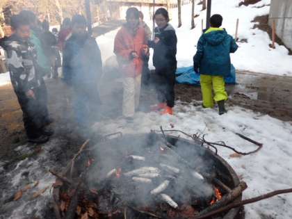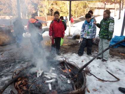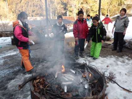 所員さんがおこしてくださった炭火の中にサツマイモを入れました。