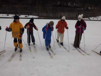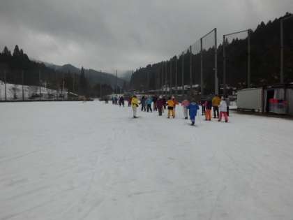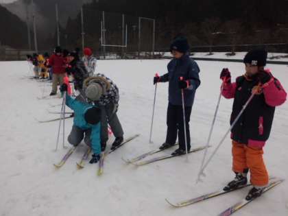 昨日のアルペンスキーで使ったのとまた違う靴と板を使います。先ずはその履き方を習いました。友だちと助け合いながら準備を進めていました。そしていよいよスタートです。