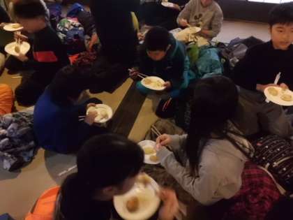 北山民家での昔の暮らしや餅のつき方について教えていただきました。今までに餅つきをした経験のある子が多く,上手につくことができていました。1人1人ついている時に,見守っている友だちから「がんばれ。」「おおっすごい。」等の声援や歓声があり,全員で盛り上がるとても良い雰囲気の中で餅つきができました。つきたてのお餅がおいしかったことは間違いありません。