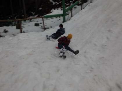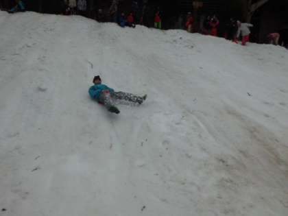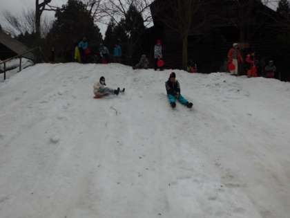 お餅つきの後は近くの斜面でソリ滑りを楽しみました。朝から所員さんたちが雪を集め固めて作ってくださった斜面です。1日目とは違う種類のソリだったので,また違う楽しみ方ができました。