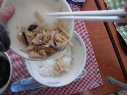 今日のきゅうしょくは,たけのこごはん・平天の煮つけ・とうふの吉野汁・牛乳でした。たけのこごはんは,春の味がしておいしかったです。