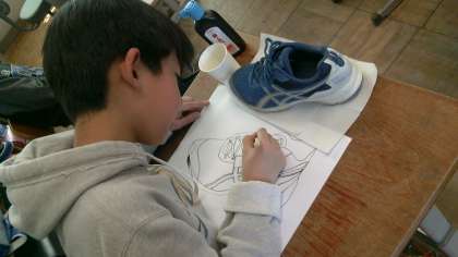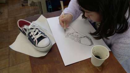 くつの細かな部分を表現するために,割りばしペンに墨汁をつけて仕上げていきました。