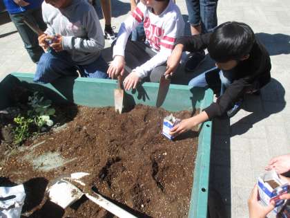 理科の学習では,前回ホウセンカとひまわりの成長の順番を予想しました。今日は実際に種を観察して,一人一人が牛乳パックに植えました。