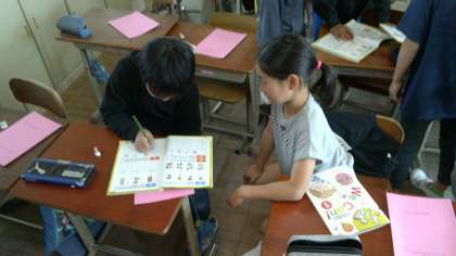 5年生になり英語の会話を聞き取ったり,英語で会話したりする量が増えてきています。自分の知っている表現を使って自分のことを紹介したり,友だちのことを一生懸命に聞こうとしています。