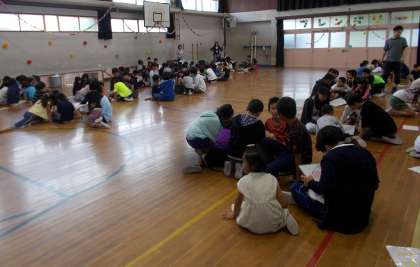 【写真上】ゲーム「1年生クイズ」をしている様子