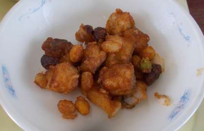 「たらと豆のアングレス」は,油であげたたらとミックスビーンズに,トマトケチャップ・ウスターソース・砂糖で作ったソースをからめて作りました。
