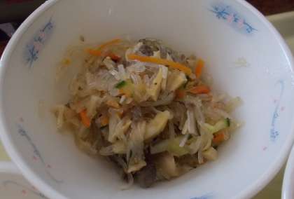 「チャプチェ」は,韓国・朝鮮の家庭料理の一つで,春雨と牛肉,いろいろな野菜を細切りにして炒めた料理です。給食では,春雨・牛肉・にんじん・きゅうり・たけのこ・しいたけを使っています。