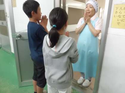 給食委員会の子どもたちは,全学年が食器などを返却し終えるまで,給食室で見守ってくれます。牛乳パックはじょうずにたためているか・ごはんのしゃもじはきちんとケースから出して返したかなどをチェックしてくれています。立ち当番が終わると,調理員さんにあいさつをします。