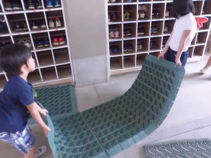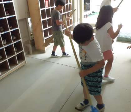 【写真下】そうじが終わると,マットを元通りにきれいに並べてくれました。1年生と3年生が力を合わせて,「よいしょ,よいしょ。」協力するとじょうずに運べましたね。これからも声をかけ合ってそうじをしてほしいと思います。