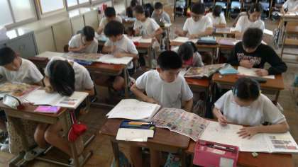 新聞広告を使って,わたしたちが食べている食料品の産地を調べ白地図に書いていきました。