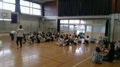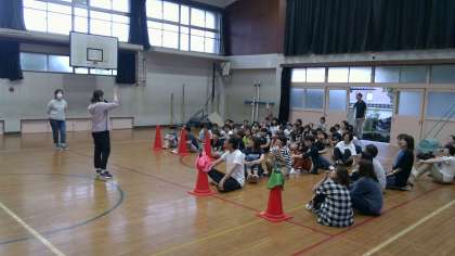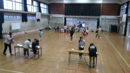辞書引きリレーと大縄跳びをグループ対抗で行いました。