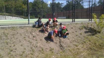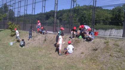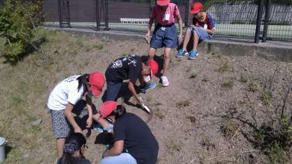 この日は,野外学習棟の方に出かけ実際に斜面に川を作りそこに水を流しました。
