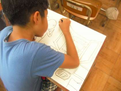 今日はアイデアスケッチをコンテで画用紙に描くところまでです。少し進んでいる人は背景に色を塗っています。
