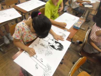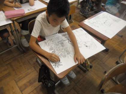 3年生の図画工作科でお話の絵にチャレンジしています。自分でお話を聞いて,お気に入りの場面を想像して描きます。