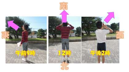 理科の学習で太陽は一日の中で動くのだろうかということを調べました。午前9時・12時・午後2時の三回に分けて観察すると,太陽の動きが分かりました。