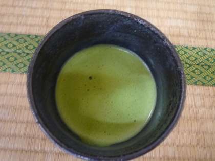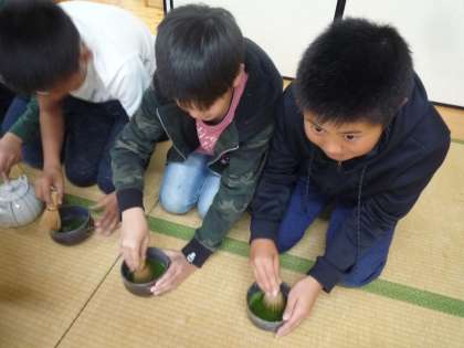 お茶をたてている様子です。たてたお茶はお友だちに出して飲んでもらいました。美味しいお茶だったそうです。
