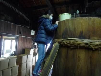 松野醤油さんに見学に行きました。醤油作りはどのような場所で行われているのか,どんな道具を使っているのかなど詳しくお話していただきました。搾りたての生醤油も味見させていただきました。醤油が作られている樽も覗かせていただきました。どのように作られているのか学ぶことができました。
