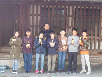 実際にお仕事体験をさせていただきました。できあがった醤油にラベルを貼り,包装をする作業を体験させていただきました。松野醤油さんでは包装も全て手作業でされているのです。やり方を教えていただいて子どもたちも挑戦しました。なかなか難しくすぐに包装することはできませんでしたが,全員包装することができました。最後に記念撮影をしました。