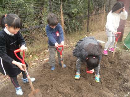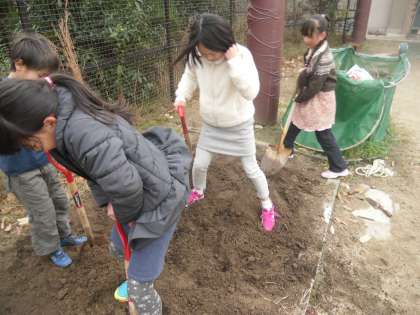 3年生はイチゴの苗を5つもらいました。社会科で農家について学習したので,育てることにしました。昼休みにボランティアで手伝ってくれる人は来てねというと5人の友だちが来てくれました。