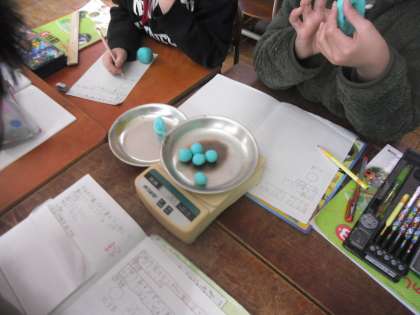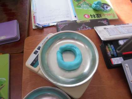 球状の粘土を子どもたちがそれぞれの形に変えて計りました。その結果は・・・・