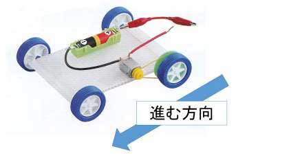 これは乾電池で動く車です。導線をつなぐと矢印の方向に動きます。これを➀と➁のようにしたいときはみなさんはどのように改良しますか?