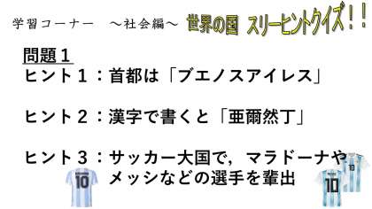 学習コーナー 〜社会編〜は,世界の国々についてのスリーヒントクイズです。