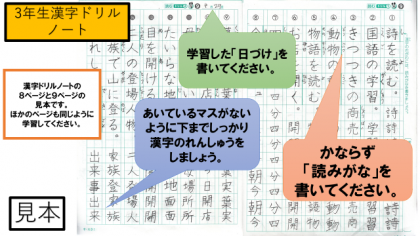 「漢字ドリル」で学習してから「漢字ドリルノート」に学習をするようにお声かけください。